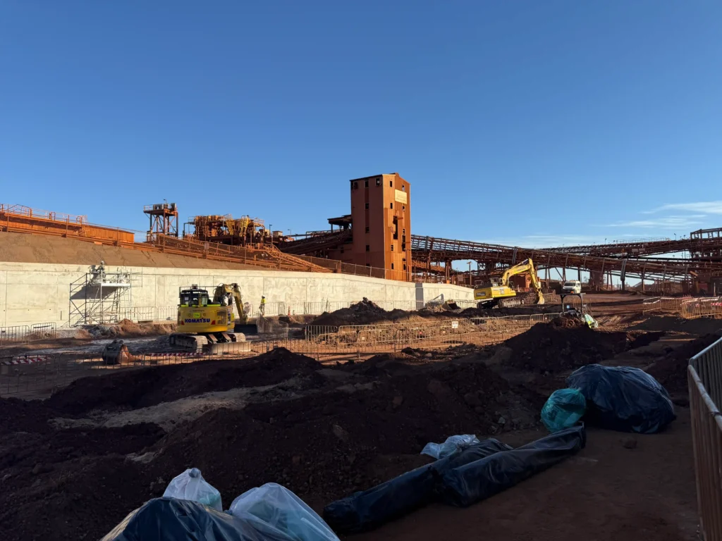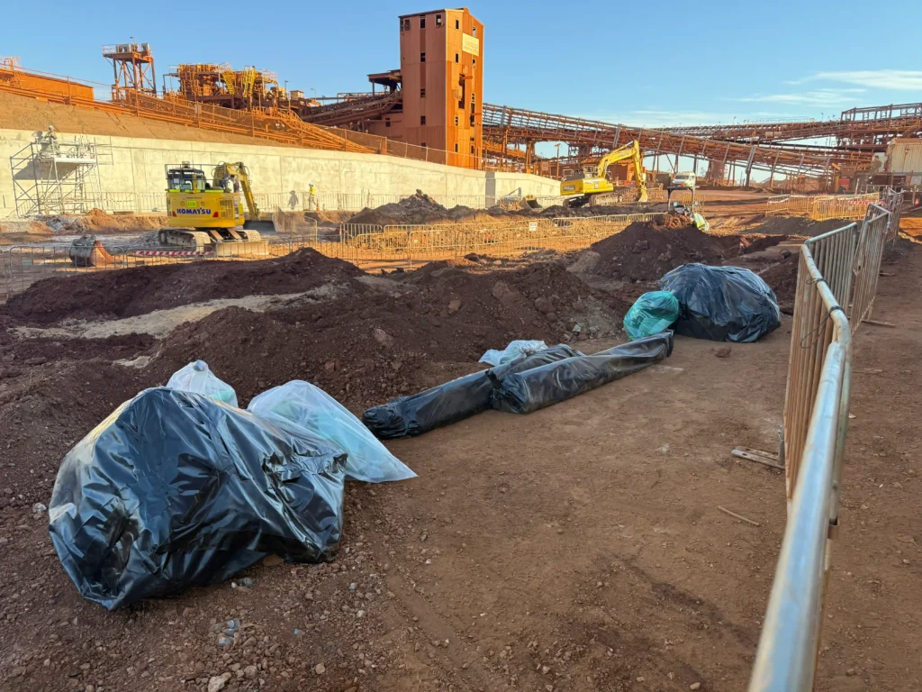 temporary exclusion fence and negative-pressure enclosure (not in frame) isolated the area from active plant traffic while the excavator loaded the secure packages into lined skips for controlled-waste transport to the licensed Newman Waste Management Facility.